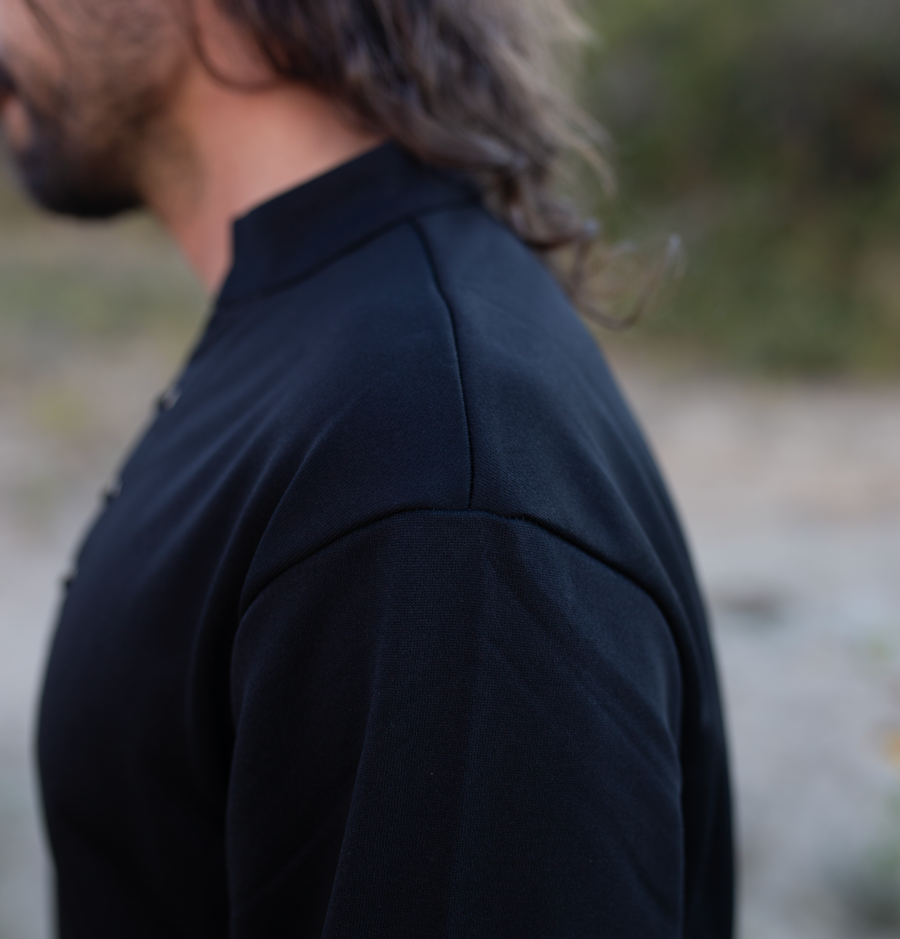 A tightly knit fabric that’s soft, sturdy, and built for cooler days. It keeps warmth close without feeling heavy or restrictive.